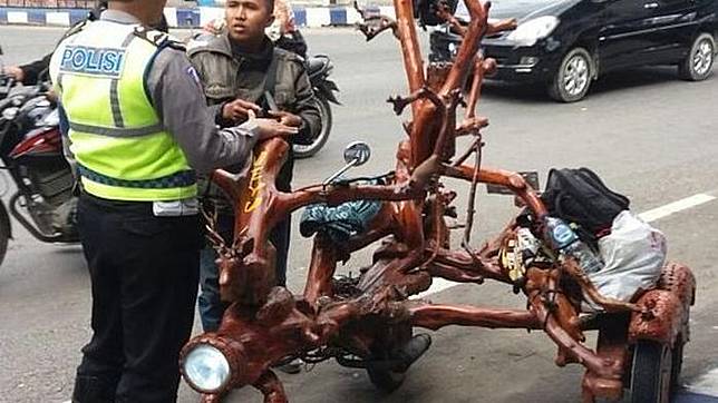 Gimana kalau ada modifikasi motor berbodi dari dahan pohon. Motor modifikasi dari dahan pohon, terlihat jelas mesinnya ada di kanan.
