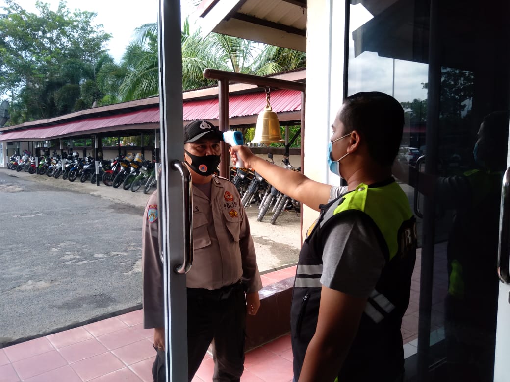 NAFAZNEWS.COM - Di hari libur pun Polres Inhil tetap ketat dalam menerapkan protokol kesehatan bagi personelnya yang melaksanakan dinas dengan melakukan pengukuran suhu tubuh dan sterilisasi, hal ini dilakukan kepada personel yang bertugas di pos jaga maupun di dalam ruangan sebagai antisipasi penyebaran virus Covid-19.